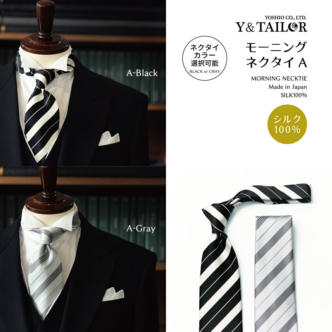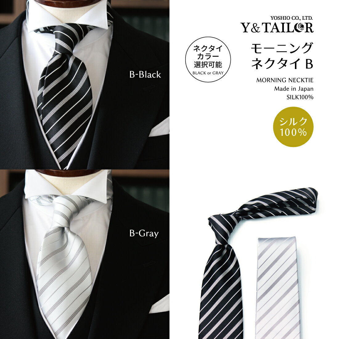 当店大人気のY&TAILORオリジナルネクタイはブラックとシルバーをお選び頂けます。