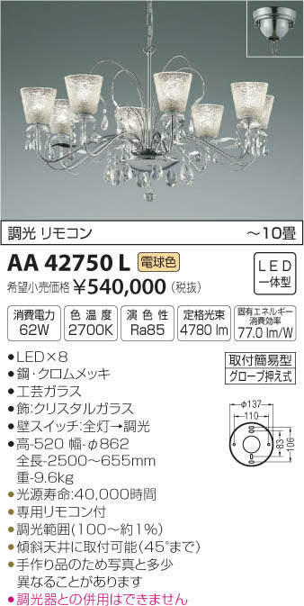 商 品 詳 細商品名コイズミ インテリア 屋内 照明メーカー名コイズミ KOIZUMIメーカー器具名称シャンデリア(装飾照明)仕様サイズ高-520 幅-φ862 全長-2500〜655mm 重-9.6kg補足・注意事項◆消費電力:62W◆色温度:2700K◆演色性:Ra85◆光源寿命:40,000時間◆専用リモコン付◆調光範囲(100〜約1%)◆傾斜天井に取付可能(45°まで)◆手作り品のため写真と多少異なることがあります◆調光器との併用はできません※色温度:2700K注意事項◆写真方向以外取り付け不可 ※施工・電気工事は専門業者にご依頼ください。