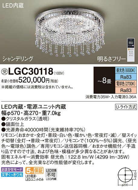 照明 おしゃれ シンプル モダン LEDパナソニック Panasonic 【シャンデリアLGC30114 昼光色〜電球色幅φ570 クリスタルガラス(透明、オーストリア製) シャンデリング 調光・調色〜8畳】 ※専用リモコン送信器同梱