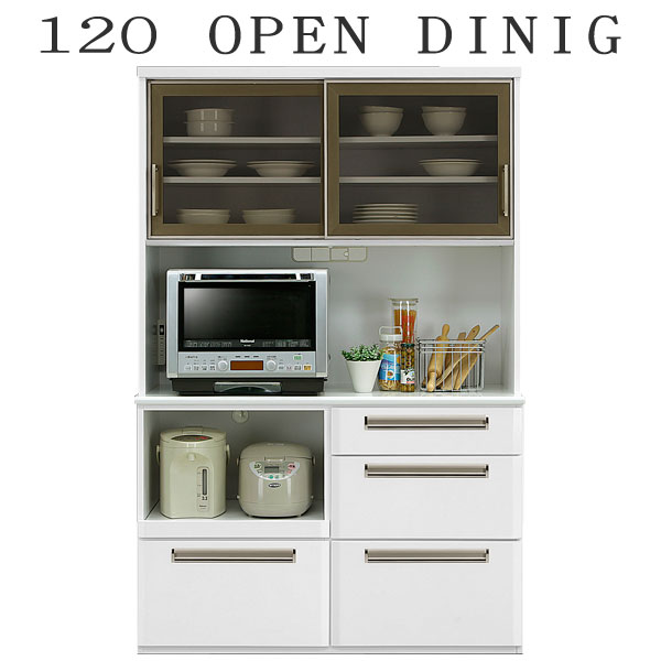 引き戸【食器棚】幅120cm【オープン】カウンター【アンティーク】スマート【カジュアル】シャープ【スライド】完成品【キッチン】食器収納【レンジ台】ダイニングボード【カントリー】白【ホワイト】ブロンズガラス【モイス】【大容量】国産
