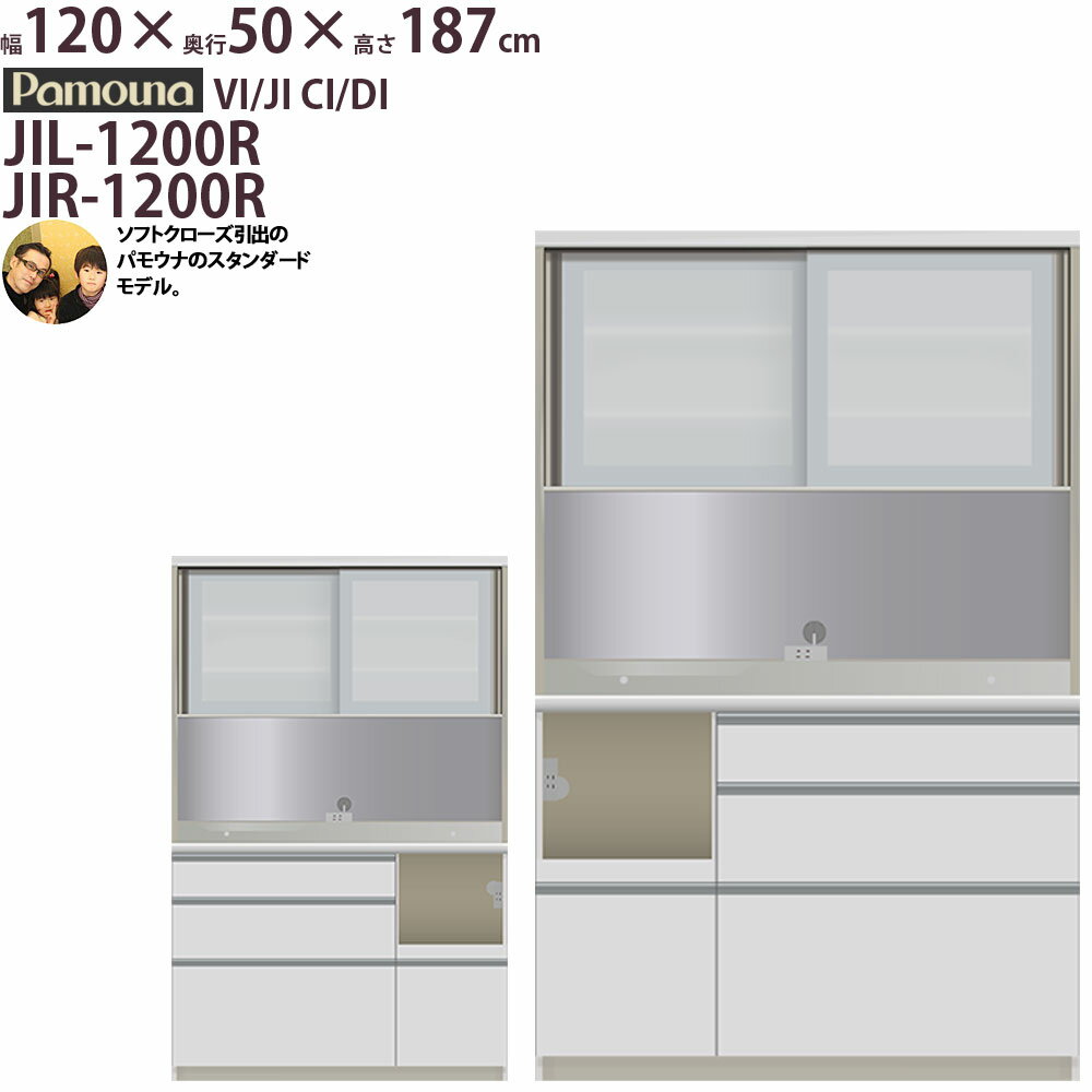 食器棚 パモウナ 120 JIL-1200R JIR-1200R 【幅120×奥行50×高さ187cm】 キッチンボード ダイニングボード レンジ台 パールホワイト ソフトクローズ仕様 引出し ダイヤモンドハイグロス 頑丈 安心 日本製 完成品 VI JI CI DI 【rev】